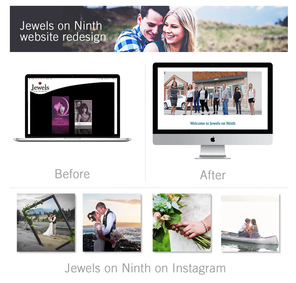 The result: After six months the newly designed website went from not showing up on Google search to dominating every local jewelry related search term. (Try doing a search for “Engagement rings in Cranbrook BC” and see how Jewels on Ninth dominates the TOP 7 organic search result listings!) Every month since implementing the content-first strategy has seen year-over-year sales growth. I often have to remove engagement rings from the Jewels on Ninth shop page when customers buy the last available ring of a certain design. Most importantly, after only one year working with a brand designer Heather and Brian are no longer considering selling their store.